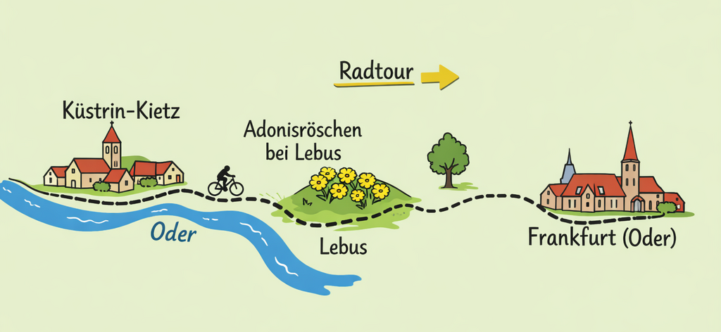 Von Küstrin-Kietz auf dem Oder-Neiße-Radweg nach Reitwein zur Trafo-Galerie und über Lebus zu den Adonisröschen nach Frankfurt (Oder).