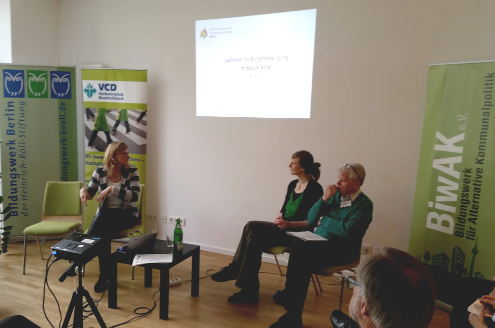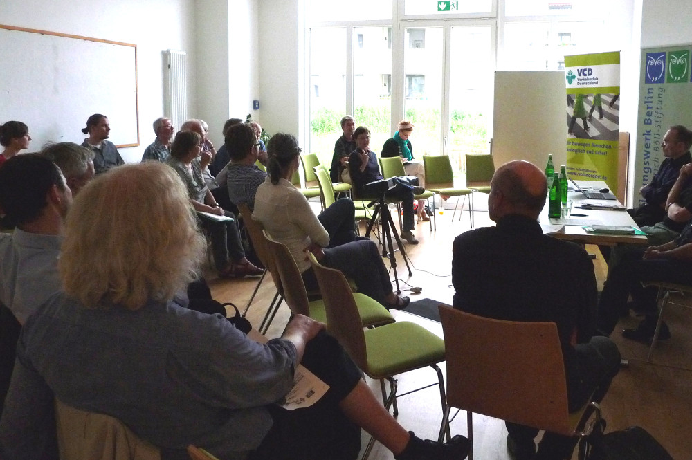 Mit 40 Teilnehmenden veranstaltete der VCD LV Nordost am 26.April in Kooperation mit dem Bildungswerk Berlin der Heinrich Böll-Stiftung und dem BiwAK (Bildungswerk für alternative Kommunalpolitik) zum dritten Mal seine jährliche Fachreihe Bürgerliches Engagement im öffentlichen Raum „Wir können was bewegen“. Das Publikum diskutierte zusammen mit lokalen Bürgerinitiativen sowie Vertreter aus der Berliner Verwaltung über die unterschiedlichen Facetten von Partiziation und Bürgerbeteiligung. Schwerpunkt ist die Vernetzung der Akteure wobei auch auf die bundesweite Kampagne „Rückeroberung der Straße“ hingewiesen wurde. Nachdem Frau Patz-Drüke den Entwurf der Leitlinien für Bürgerbeteiligung für den Bezirk Mitte vorstellte, folgte eine Kurzvorstellungen von zwei Bürgerinitiativen. Daraus ergaben sich ausreichend Diskussionsstoff unter den Teilnehmenden und führte zu einer lebhaften und erfolgreichen Veranstaltung. (Einhellig wurde angeregt diese Fachreihe im nächsten Jahr fortzuführen).