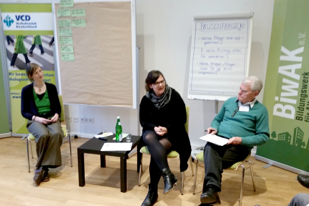 Marion Laube, die ehemalige Vorstandsvorsitzende des VCD Nordost, begrüßte die Teilnehmenden. Daraufhin stellte zunächst Ralf Ganser (Berliner Staatskanzlei) die Beteiligungsplattform "meinBerlin" vor, auf der in Zukunft alle öffentlichen Beteiligungsverfahren in Berlin für die Bürgerinnen und Bürger erreichbar sein sollen. Im Anschluss berichtete der Geschäftsführer des Stadtteilausschusses Kreuzberg e.V. von der praktischen Arbeit im Bereich "Bürgerbeteiligung bei bezirklichen Mobilitätsanliegen". Die Teilnehmenden aus verschiedenen Berliner Initiativen nutzen am Ende die Gelegenheit für Fragen, Erfahrungsaustausch und Vernetzung.
