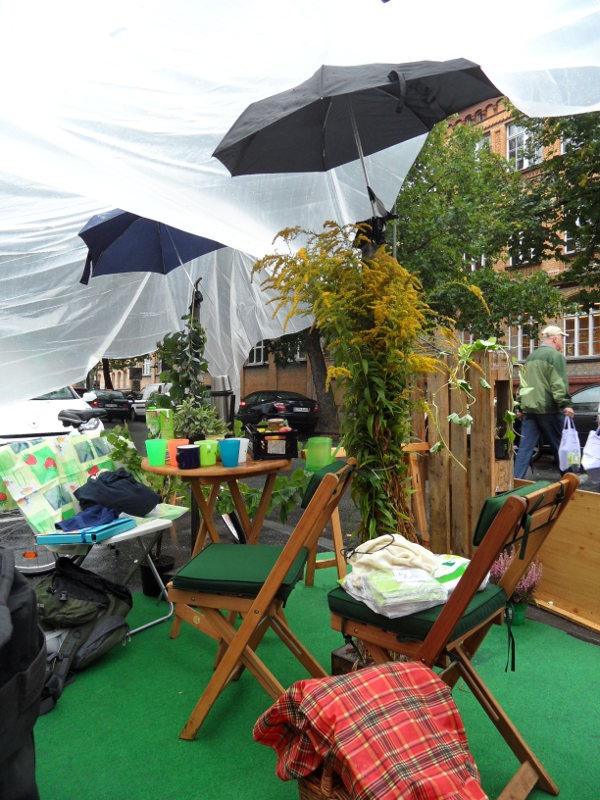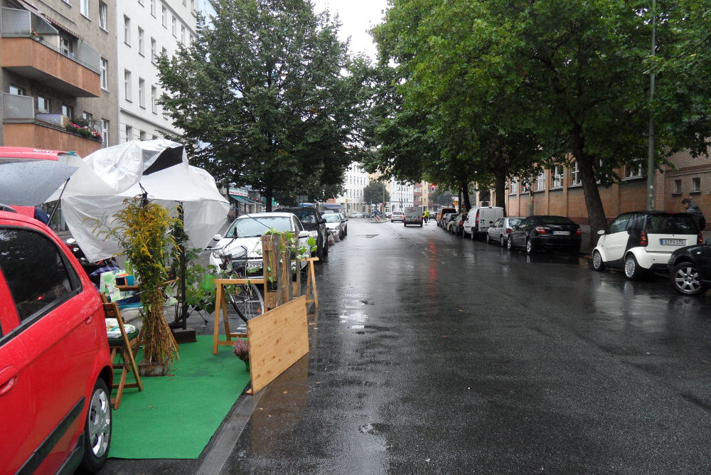 Am 20. September 2013 war weltweit PARK(ing) Day: Ein Aktionstag, bei dem Parkplätze zu lebendigen, grünen Lebensräumen umgewandelt werden. Der VCD war mit einer Aktion in Wedding dabei und baute dort zusammen mit Aktiven der Initiative „Weddingwandler“ zwischen parkenden Autos eine kleine grüne Oase. Am Ende der Aktion waren wir etwas durchgekühlt und nass, aber auch zufrieden, da doch einige Passanden trotz des schlechten Wetters interessiert stehen blieben und angeregt mit uns über die Gestaltung der Städte sprachen.