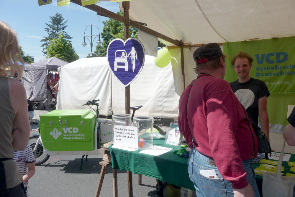 Am dritten Freitag im September wird alljährlich weltweit zum Park(ing) Day aufgerufen. Dabei geht es darum, Parkflächen für Autos umzuwidmen und damit den Straßenraum für Menschen zurückzuerobern. In Berlin lag in diesem Jahr ein Schwerpunkt der Aktivitäten auf der Bergmannstraße. Mit unserer Kampagne "Miteinander unterwegs" hatten wir unseren Infostand an der nahegelegenen Marheinekehalle aufgestellt. Dort wiesen wir auch auf die Park(ing)-Day-Aktivitäten hin, legten unseren Fokus aber auf unser Kampagnenthema: die Verkehrssicherheit.