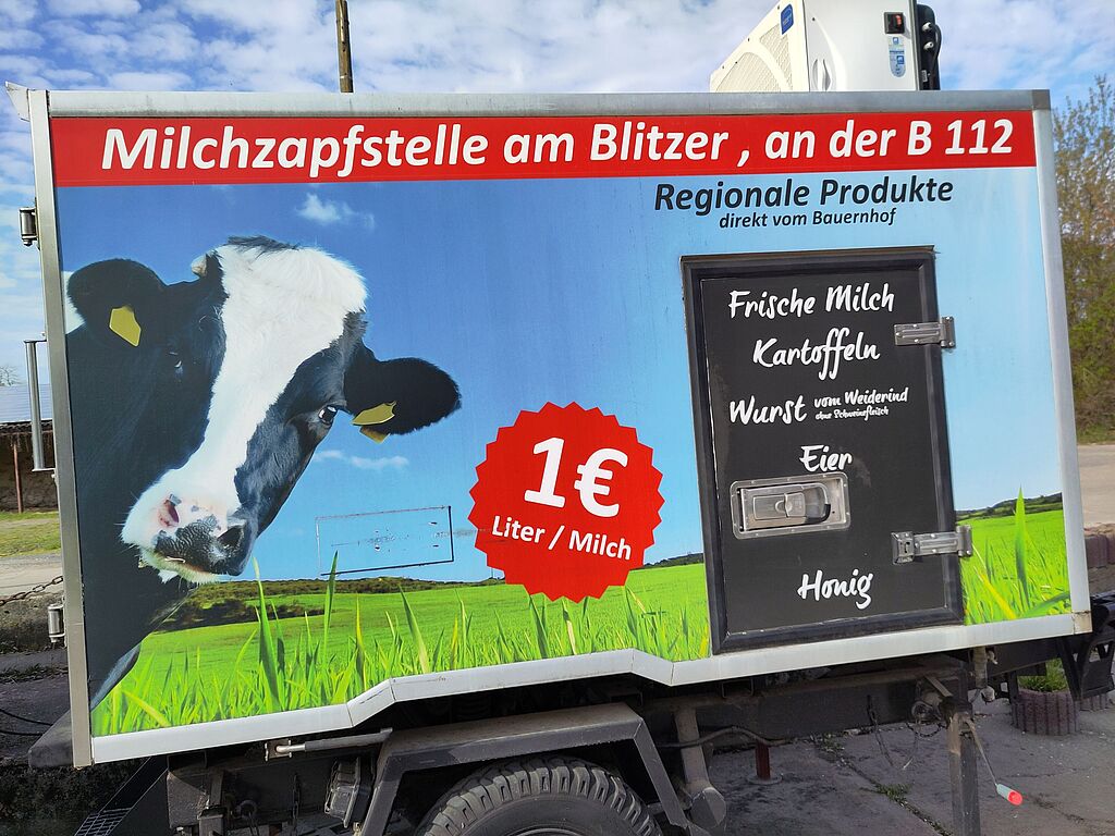 Kurz vor Erreichen der Stadt Frankfurt (Oder) erreichen wir einen Hofladen in Form von Automaten und Milchzapfstelle, in welchem regionale Produkte erworben werden können.