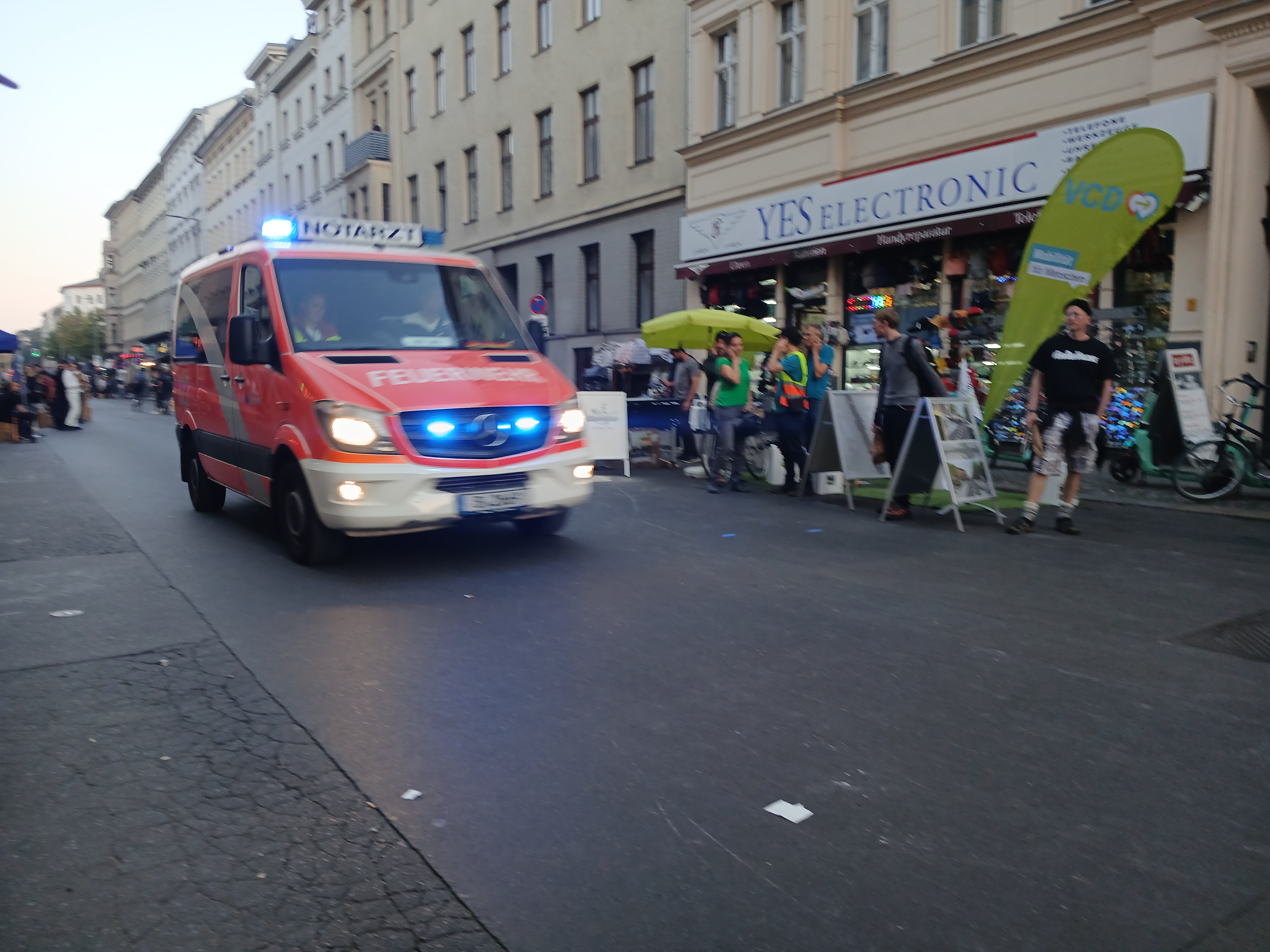 Die extreme Flexibilität einer Lebensraumgestaltung, die nicht von PKWs und deren Abställplätzen dominiert ist zeigte sich, als ein Krankenwagen durch die Straße fahren musste. Binnen Sekunden bildete sich in der Mitte der Straße eine Rettungsgasse, die Einsatzkräfte konnten ungestört ihren Weg fortsetzen und das lockere Treiben konnte ungestört weitergehen.