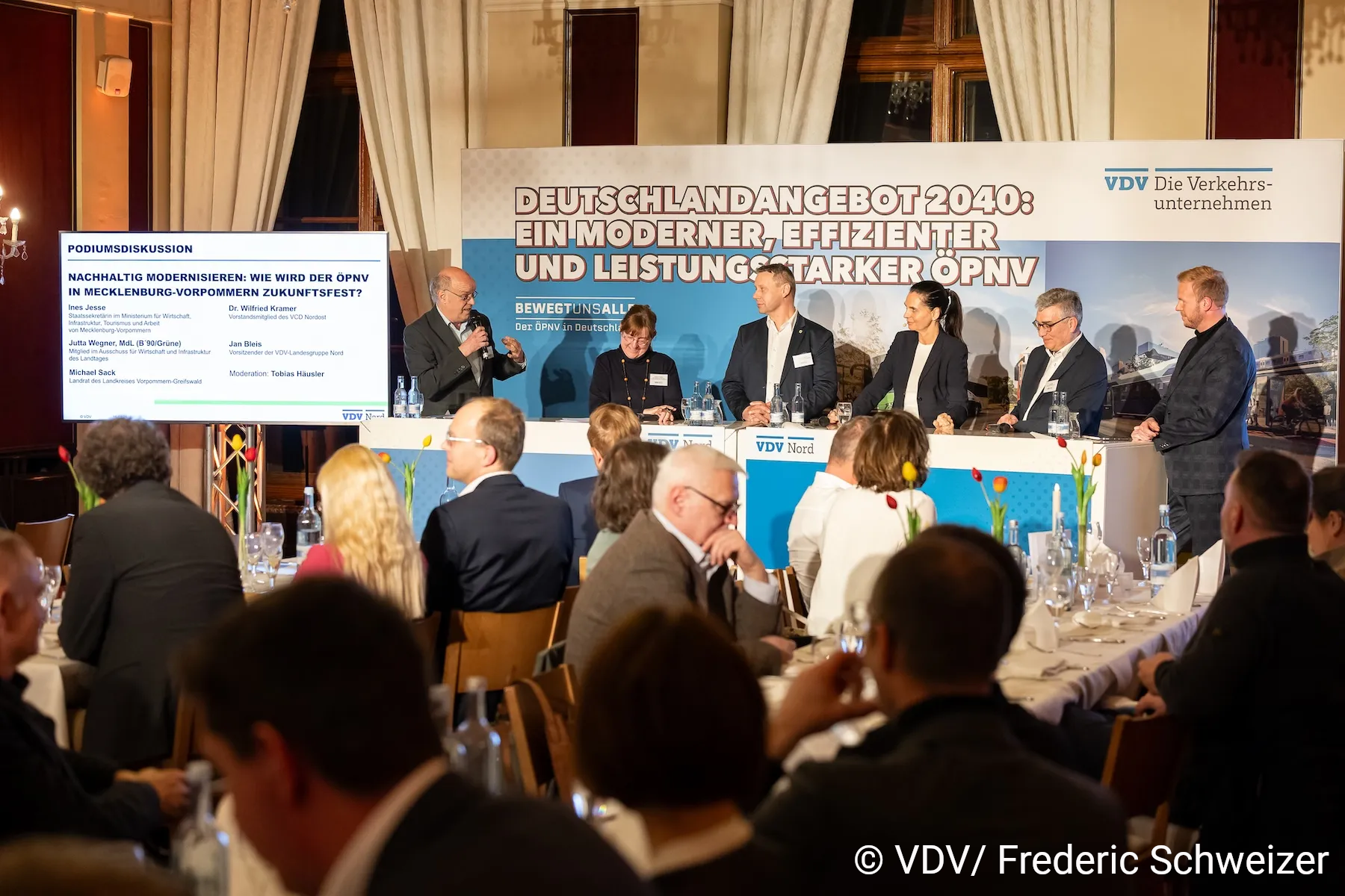 Beim Parlamentarischen Abend des Verbandes Deutscher Verkehrsunternehmen (VDV) am 16. März in Schwerin diskutierten Vertreterinnen und Vertreter aus Politik, Verkehrsunternehmen und Verbänden über die Zukunft des öffentlichen Personennahverkehrs (ÖPNV) in Mecklenburg-Vorpommern (MV). Für den Verkehrsclub Deutschland (VCD) Nordost nahm Dr. Wilfried Kramer an der Podiumsdiskussion teil und machte deutlich, welche Schritte aus Sicht des Fahrgastverbands jetzt notwendig sind, um den Nahverkehr im Land für mehr Menschen attraktiv zu machen.