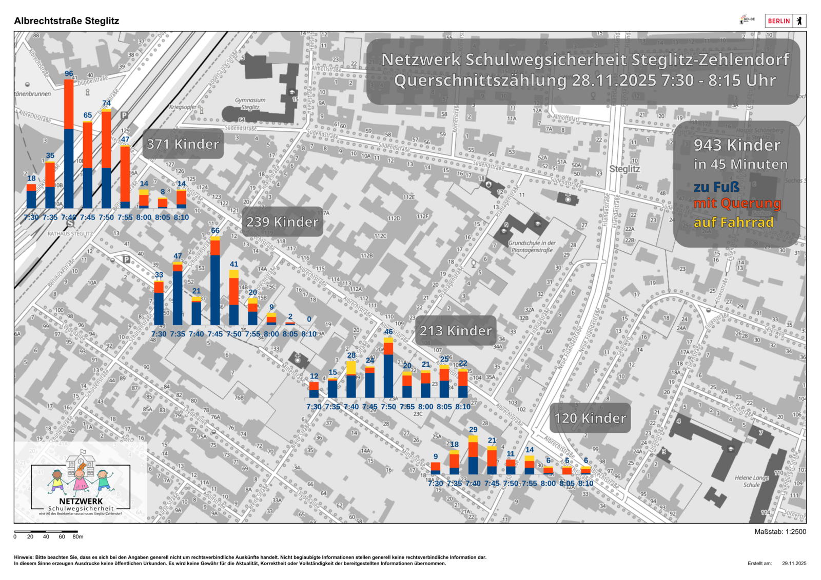Irritiert durch diese Zahlen, die dem täglichen Erleben zahlreicher Kinder (und Eltern) diametral entgegenstanden, veranlasste das Netzwerk Schulwegsicherheit Steglitz-Zehlendorf, ein Zusammenschluss von Ehrenamtlichen aus über 20 Schulen im Bezirk und offizielle AG des Bezirkselternausschusses (BEA), Ende November eine eigene Zählung.