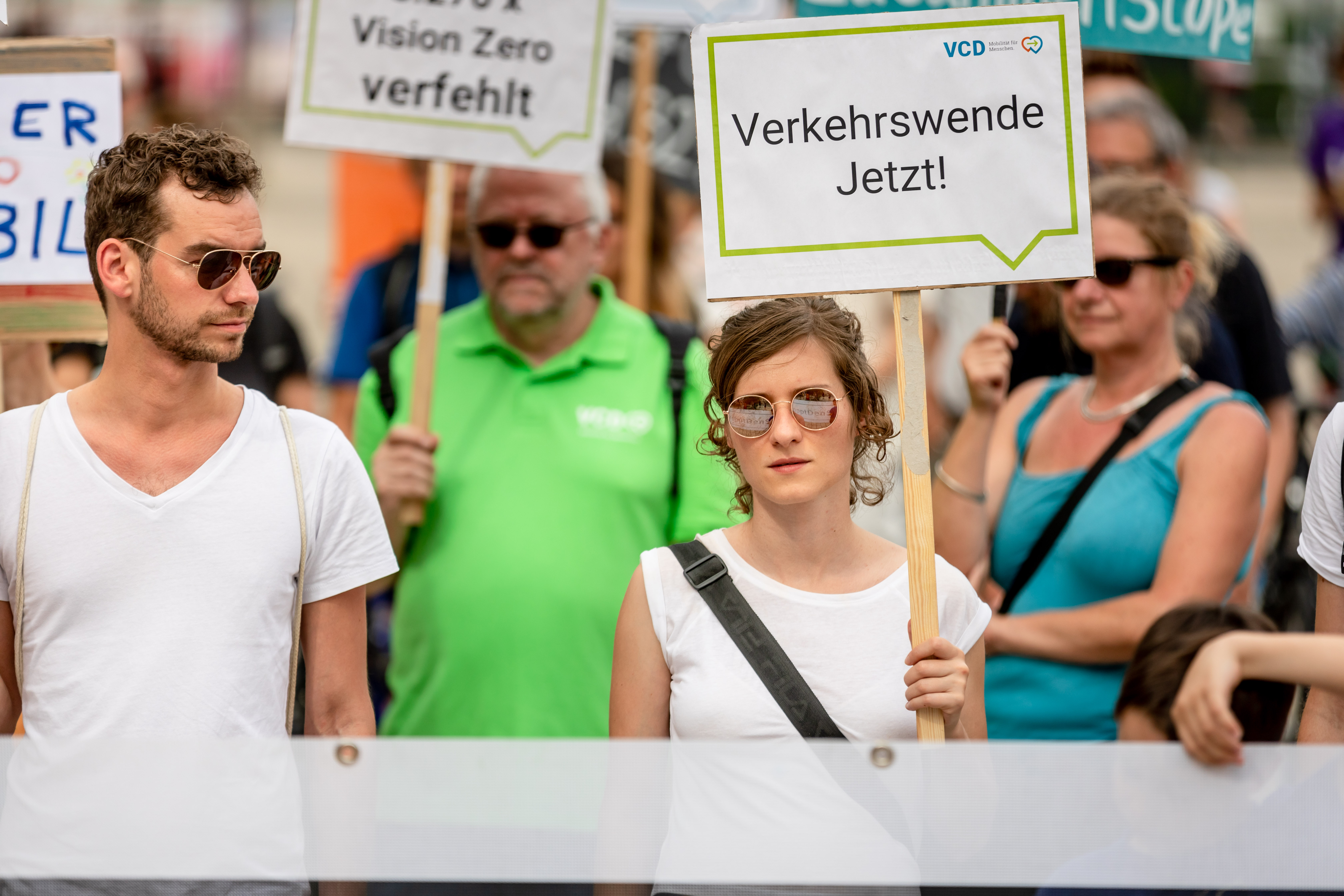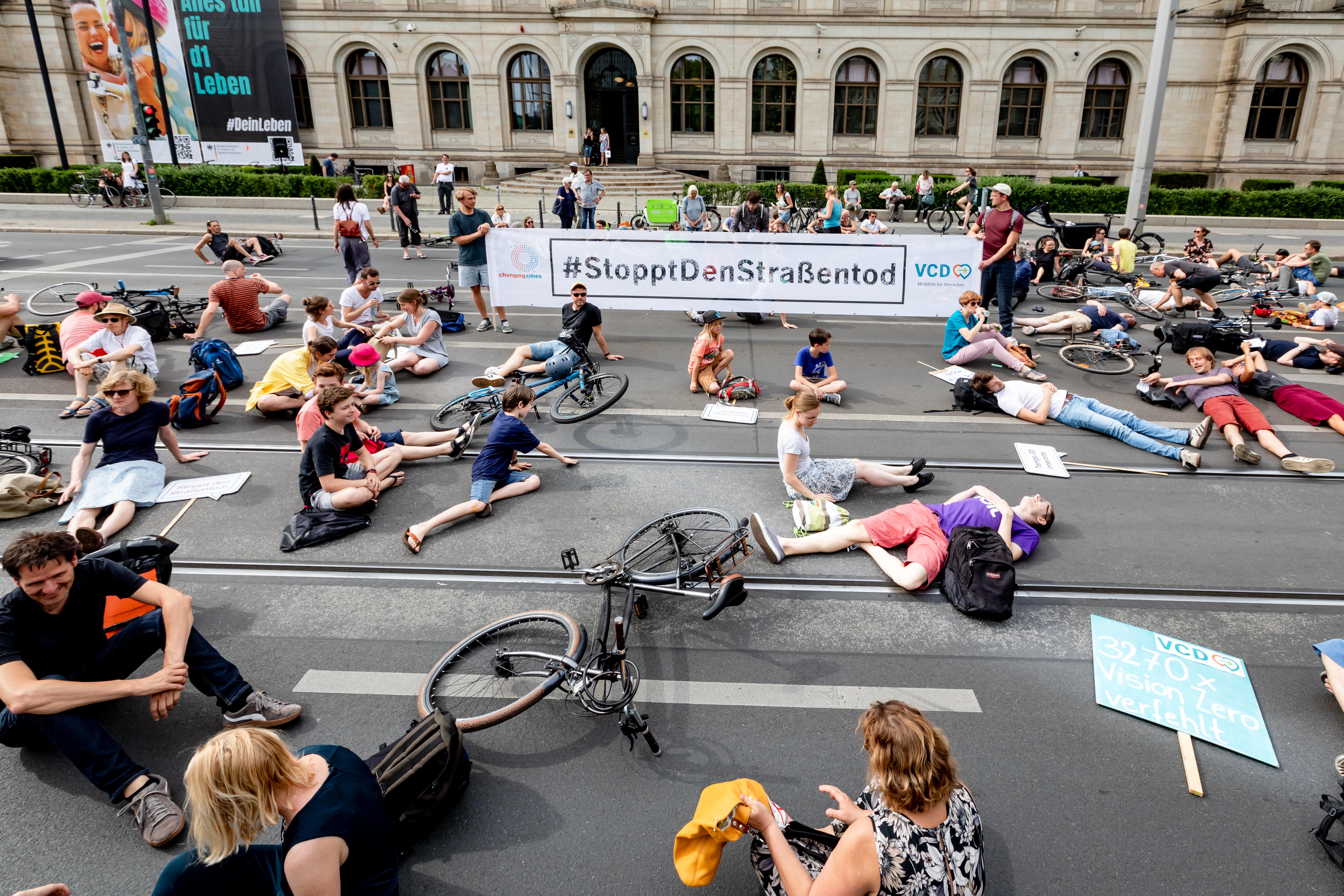 Unter dem Motto „Stoppt den Straßentod“ protestierten am 14.06.2019 zahlreiche Menschen mit einem Trauermarsch und anschließendem „Die-In“ vor dem Bundesverkehrsministerium (BMVI) für eine Verkehrspolitik, die alle am Leben lässt. Zum Gedenken an die 3.270 Verkehrstoten im letzten Jahr legten sich die Demonstranten für fünf Schweigeminuten bewegungslos vor das Ministerium. Im Anschluss zogen sie ihre Körperumrisse mit Kreide nach. Zugleich stellten Aktivisten ein symbolisches Mahnmal für die mehr als 700.000 Menschen auf, die seit 1949 in Deutschland im Straßenverkehr getötet wurden. Zu dem Protest hatten der ökologische Verkehrsclub VCD, der Verein Changing Cities und das Personenbündnis Mahnmal für die Verkehrstoten anlässlich des Tages der Verkehrssicherheit (15. Juni) aufgerufen.