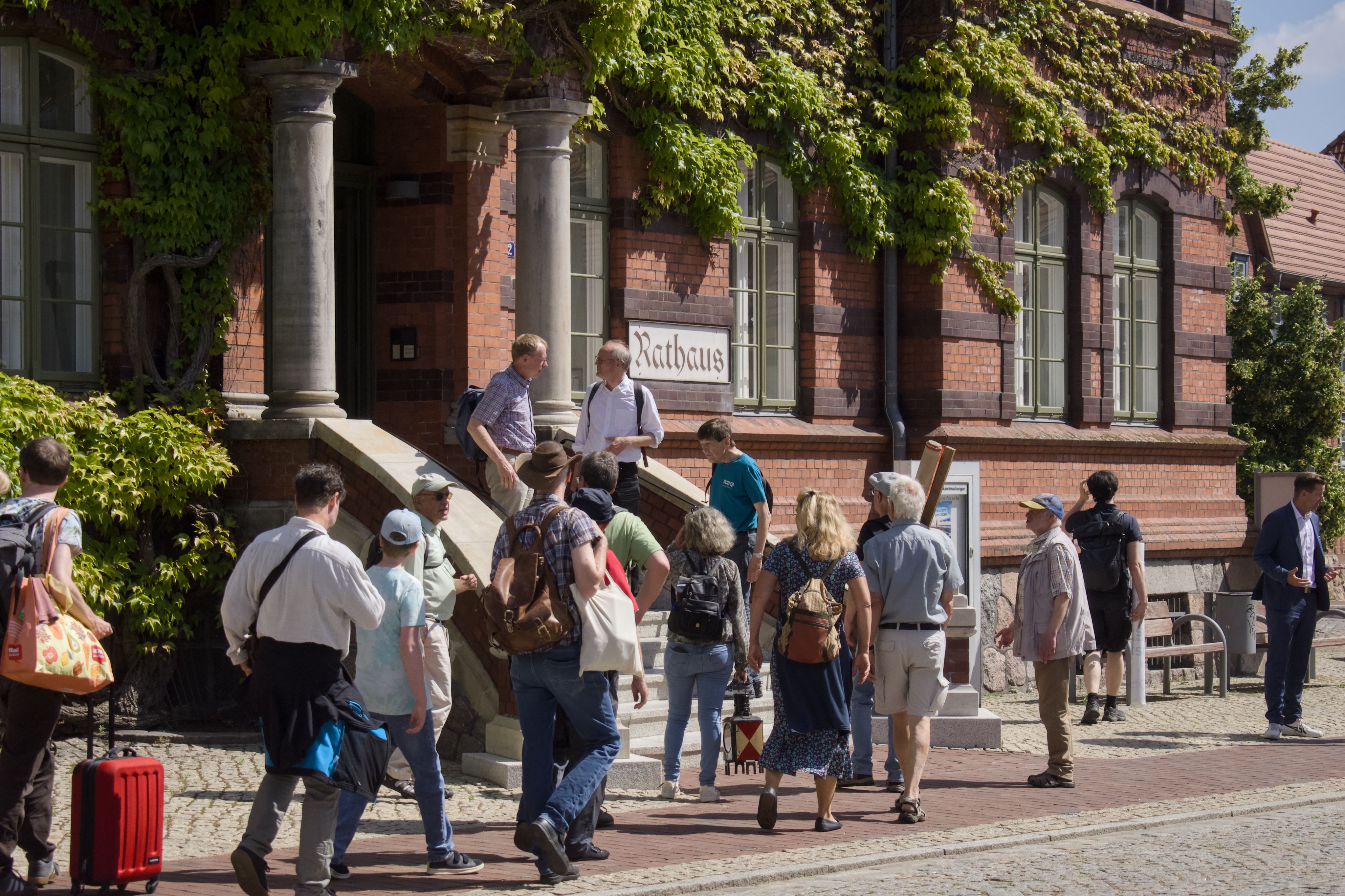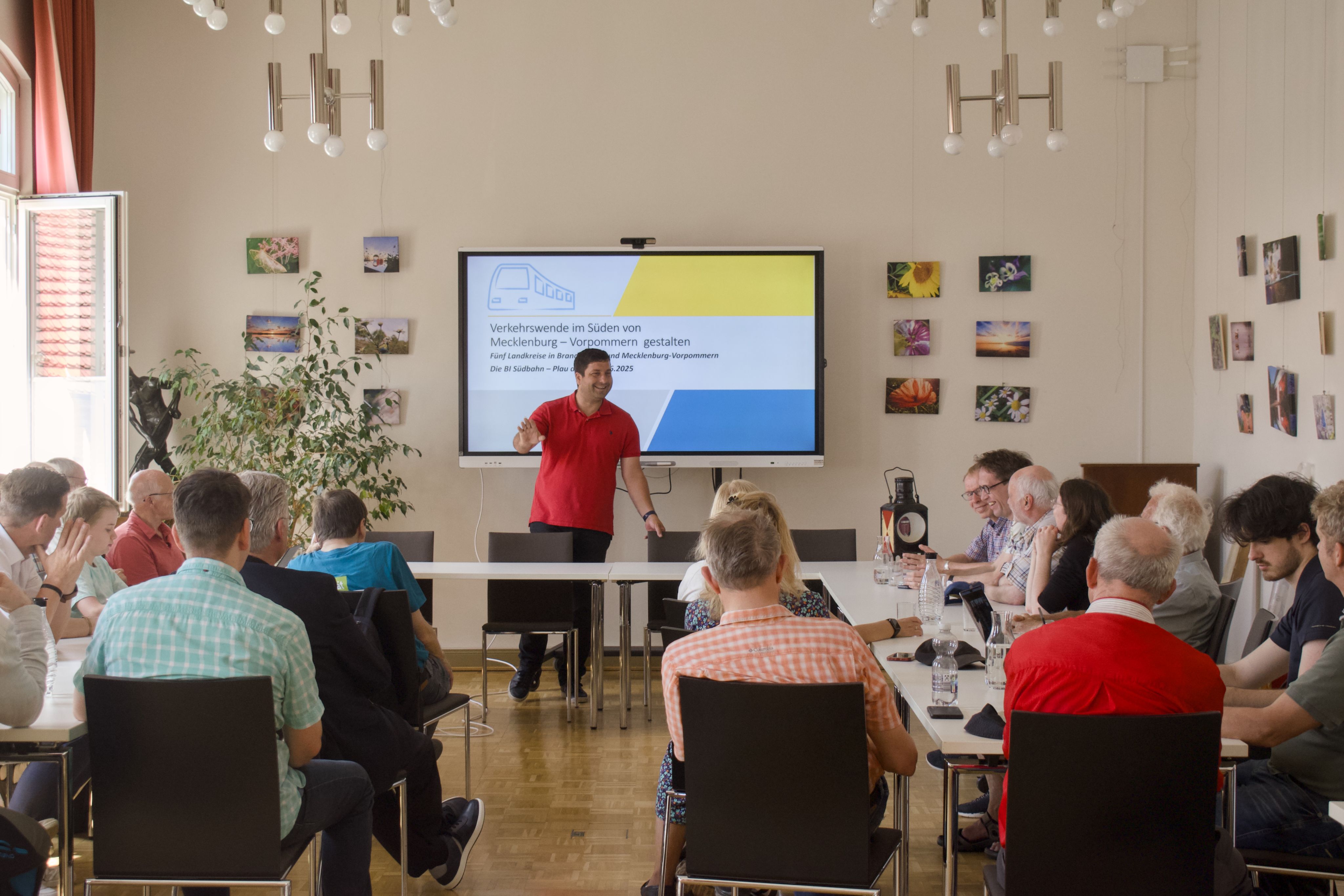 Die Exkursion begann mit einer Auftaktaktion am Bahnhof in Plau am See, anschließend ging es gemeinsam zum Rathaus. Dort begrüßte Bürgermeister Sven Hoffmeister die Gruppe und betonte die große Bedeutung der Bahnverbindung für die Stadt und die gesamte Region – sowohl für Pendlerinnen und Pendler als auch für den Tourismus. Im Ratssaal folgten Beiträge von Vertreterinnen und Vertretern des VCD, der BI Südbahn sowie aus der Landespolitik. Wolfgang Waldmüller (Mitglied des Landtages MV), Christian Brade (Mitglied des Landtages MV) und Astrid Becker (Bürgermeisterin von Lübz) betonten, dass der ländliche Raum bei der Infrastruktur nicht länger vernachlässigt werden dürfe. Heiner von Marschall, Landesvorsitzender des VCD Nordost, forderte einen stufenweisen Ausbau der Strecke ohne lange Sperrpausen. Nötig seien klare politische Entscheidungen für einen Betrieb an 365 Tagen im Jahr. Constantin Pitzen von der Fahrplangesellschaft hob die Bedeutung einer abgestimmten Taktung zwischen Zug- und Busverkehr hervor, um die Region zuverlässig zu erschließen.