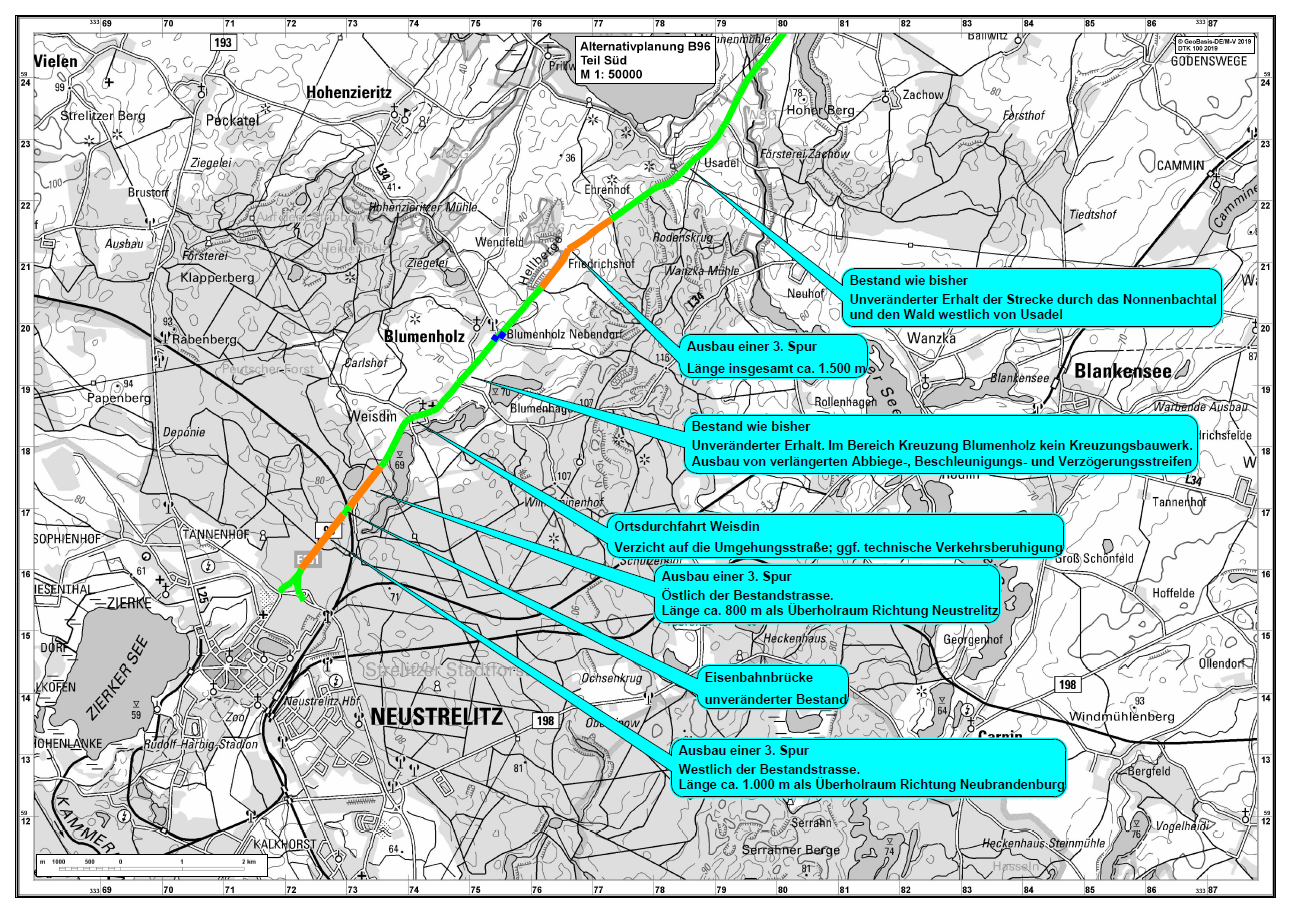 Das Aktionsbündnis "B96- Ausbau: So nicht!", dem auch der VCD Nordost angehört, hat Alternativplanungen für einen schonenden, umweltverträglichen Ausbau der B96 zwischen Neustrelitz und Neubrandenburg vorgelegt. Darin erkennt das Aktionsbündnis an, dass an einigen Streckenabschnitten Möglichkeiten bestehen, um sichere Überholmöglichkeiten zu schaffen.