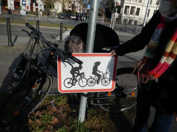 Die Initiative Friedrich Wilhelm Platz hat neue Verkehrsschilder entworfen und auch gleich selber angebracht, um an Konfliktpunkten zwischen Fahrrad- und Fußverkehr alle Beteiligten vor bestehenden Gefahren zu warnen. Klasse Aktion!